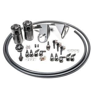The catch can draws out oil and water condensation from the crankcase gasses that would otherwise be drawn into the intake manifold. This prevents oil buildup in the intake, intercooler system walls, throttle body, and intake manifold. This effectively raises the octane, can increase engine performance from cleaner inlet air, and can lower hydrocarbon emissions. The closed system prevents unwanted oil vapors from entering into the cabin. Catch can kits include everything needed for a complete installation.