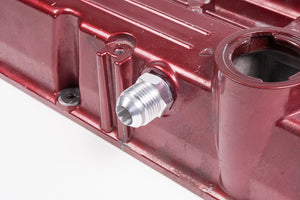 This fitting features a 10AN male and a 16.6mm diameter press-in portion. It can be used as a weld-in for universal use, or as press-in fitting specifically for the USDM Mitsubishi EVO 8-9 magnesium valve cover.