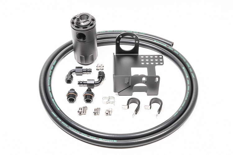 The catch can draws out oil and water condensation from the crankcase gasses that would otherwise be drawn into the intake manifold. This prevents oil buildup in the intake, intercooler system walls, throttle body, and intake manifold. This effectively raises the octane, can increase engine performance from cleaner inlet air, and can lower hydrocarbon emissions. The closed system prevents unwanted oil vapors from entering into the cabin. Catch can kits include everything needed for a complete installation.