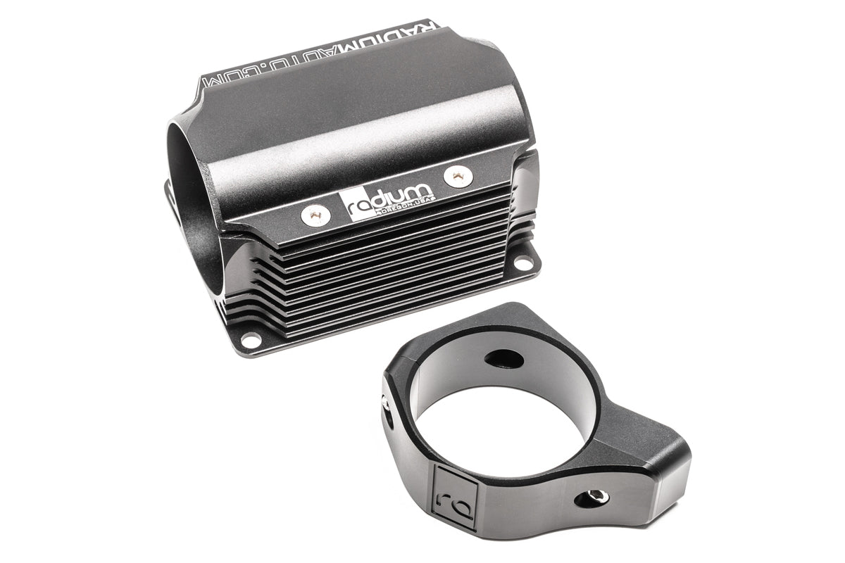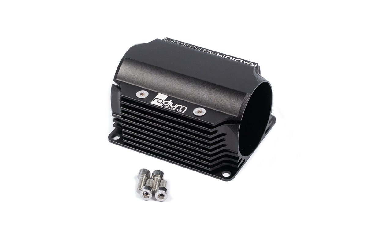 With engine power levels globally increasing, pump heat is fast becoming an issue in fuel systems. This custom extrusion includes cooling fins that help dissipate heat. The conductive 6063 aluminum design directly clamps to the fuel filter body with 2 countersink stainless steel screws. For maximum efficiency, this unit must be mounted in a location where cool air can pass through the cooling fins, such as underneath the vehicle. Four M6x1mm stainless steel screws are included for mounting to the chassis. The unit is anodized black with a laser engraved design.