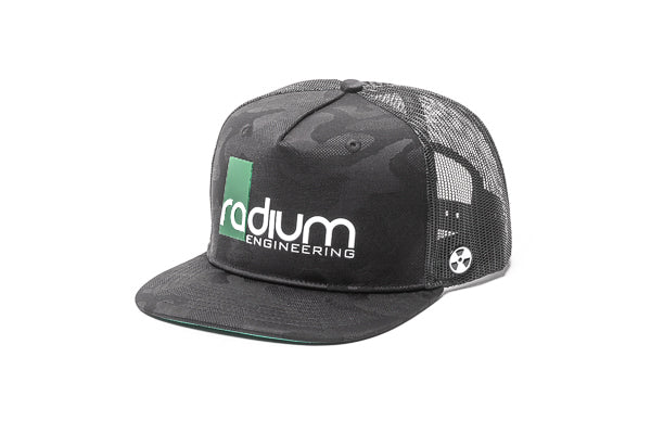 Black camouflage trucker hat. Flexible sizing with snap-back. Fits large and small heads.