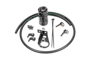 The catch can draws out oil and water condensation from the crankcase gasses that would otherwise be drawn into the intake manifold. This prevents oil buildup in the intake, intercooler system walls, throttle body, and intake manifold. This effectively raises the octane, can increase engine performance from cleaner inlet air, and can lower hydrocarbon emissions. The closed system prevents unwanted oil vapors from entering into the cabin. Catch can kits include everything needed for a complete installation.