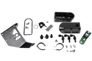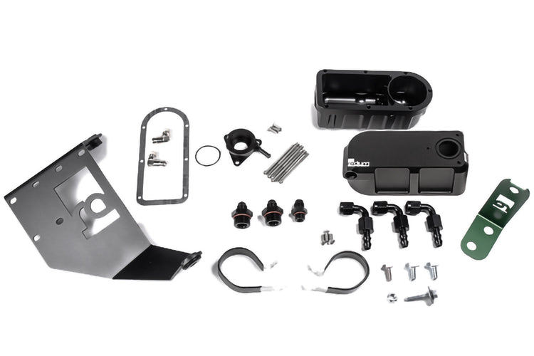 The mount uses all factory threaded mounted holes. Because of this, there is no need to drill or modify anything as it bolts in. Install is a fairly simple process that can be performed by an average mechanic. Everything is accessible with the rear clam intact. Aluminum Pushlok hose ends are included to convert the factory coolant hoses into 6AN.