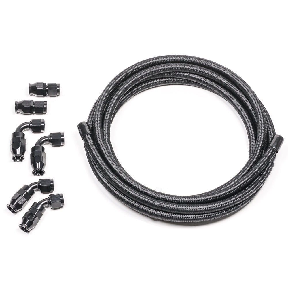 Each hose features a seamless extruded PTFRE core wrapped in a stainless steel wire braid and finished with a durable braided PET jacket. All hose ends are constructed from type-II black anodized aluminum for excellent corrosion resistance and a clean, professional finish.