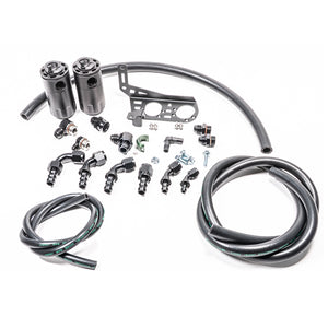 The catch can draws out oil and water condensation from the crankcase gasses that would otherwise be drawn into the intake manifold. This prevents oil buildup in the intake, intercooler system walls, throttle body, and intake manifold. This effectively raises the octane, can increase engine performance from cleaner inlet air, and can lower hydrocarbon emissions. The closed system prevents unwanted oil vapors from entering into the cabin. Catch can kits include everything needed for a complete installation.