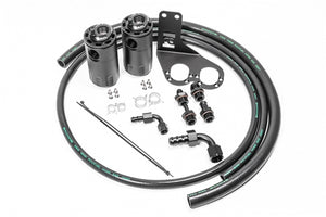 The catch can draws out oil and water condensation from the crankcase gasses that would otherwise be drawn into the intake manifold. This prevents oil buildup in the intake, intercooler system walls, throttle body, and intake manifold. This effectively raises the octane, can increase engine performance from cleaner inlet air, and can lower hydrocarbon emissions. The closed system prevents unwanted oil vapors from entering into the cabin. Catch can kits include everything needed for a complete installation.