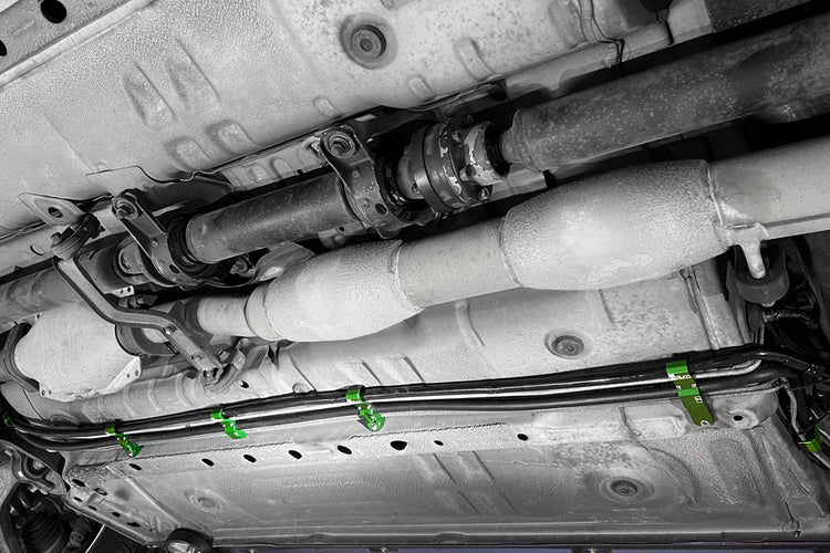The Radium Engineering fuel/brake line retainers replace the plastic clips that secure the OEM hard lines underneath Mitsubishi Evolution 1-6. These billet aluminum clamps support a large aftermarket fuel feed line.