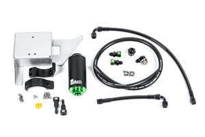 For plumbing, 6AN PTFE hoses and 6AN fittings are provided to adapt to the OEM feed line and fuel rail. Furthermore, a replacement EVAP line is included to simplify installation. The kit can also be purchased as the mount only if you wish to purchase a filter separately and run custom plumbing.