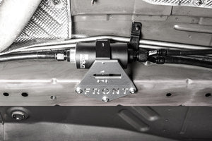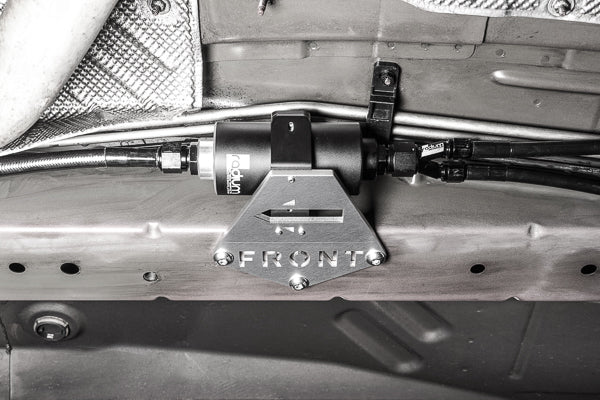 Hardware for installing a Radium Engineering fuel filter in a 5th gen Camaro. Stainless steel M10 bolts secure a thick aluminum bracket to 3 threaded bosses on the chassis. The "FRONT" and engraved arrow are incorporated to prevent the user from installing it upside down and/or backwards. The billet aluminum 60mm clamp secures to this bracket using stainless steel screws.