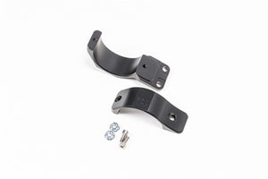 Hardware for installing a Radium Engineering fuel filter in the MK5 Supra. The upper half of the billet aluminum clamp secures to OEM threaded studs using the provided flange nuts. These studs are on the opposing side of the plastic undertray just to the left of the transmission. The lower half of the billet aluminum clamp secures the filter using stainless steel bolts.