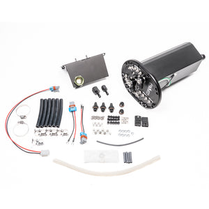 The Radium Engineering fuel surge tank hanger can be used with up to three aftermarket high pressure pumps and 1 lift pump in the stock Mazda FD RX7 fuel tank. The unique integrated 1.85L surge tank completely eliminates fuel starvation. No grinding, bending, or modification of the trunk floor sheet metal is required.