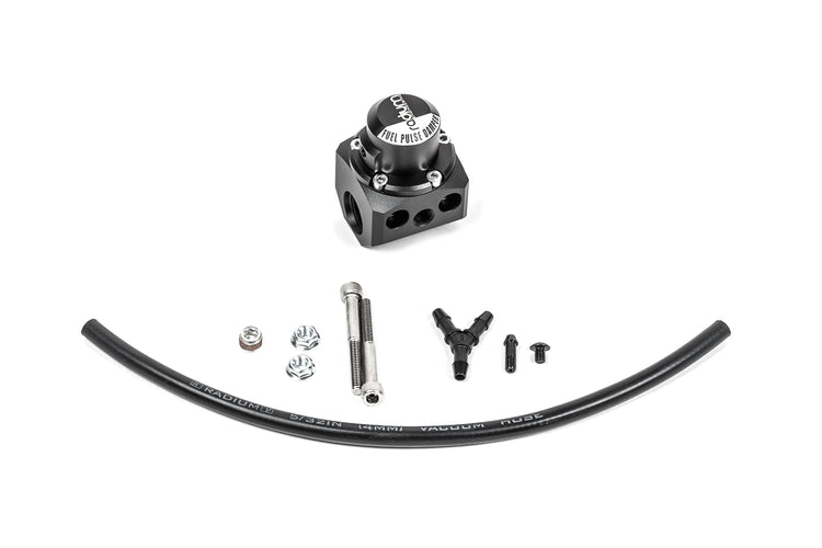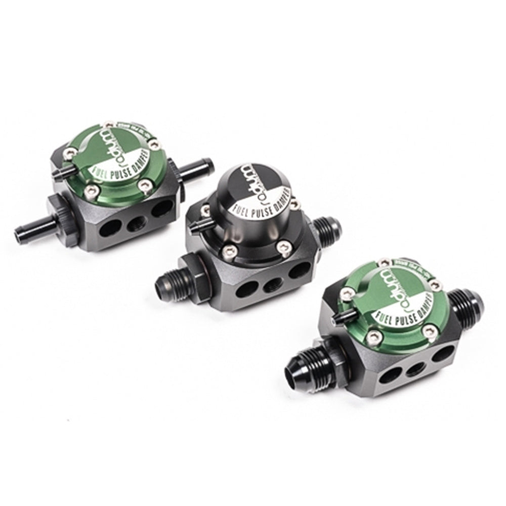 The opening and closing of fuel injectors creates pressure pulses in the fuel rail; this can lead to unstable fuel pressure. In order to achieve a safe and consistent rail pressure, a fuel pulse damper (FPD) is often necessary. The FPD's internal diaphragm will absorb oscillating pulses and stabilize fuel pressure. This correction can be measured throughout the RPM range and can often help idle surge, especially with high flow injectors. Furthermore, a fuel pulse damper can help solve erratic lean air/fuel ratio spikes, commonly experienced as 'stumbling', that are difficult to tune out.