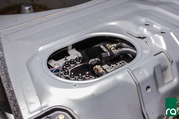 Unlike the 2004-2007 WRX STi OEM variation, the Radium Engineering collector box has been optimized to work in ALL gas tanks. Shown below is the smallest OEM gas tank baffle found in the model list above. It improves the fuel supply around the pump(s) inlet. There is a 1-way fill valve incorporated on the front side of the tank that flows 355LPH. It serves as a trap door keeping the pump(s) supplied with fuel during aggressive driving. Furthermore, all returning fuel from the pressure regulator return and the crossover hose enter the collector box keeping it full. The OEM fuel level and fuel temperature sensors secure to the mounting bracket.