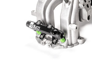 The slotted hole positioning below is specifically for the Subaru EJ253 intake manifold. Moving the adapters outwards allows fuel rail fitment for the Ver 8/9 JDM EJ207 STi intake manifold.