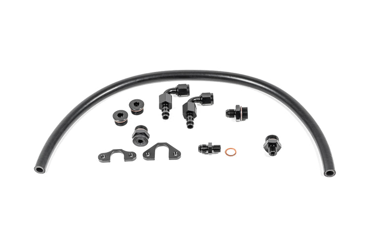 20-1270-PK Fuel Rail Plumbing Honda B-D-F-H-SeriesThe plumbing kit includes the items shown. It allows an easy connection to the factory feed with a 6AN hose. It is intended to be used with the factory fuel pressure regulator (FPR), however, an aftermarket FPR can be used instead. The kit Includes 2 different FPR adapters compatible with all OEM Honda FPRs. Plugs are provided as well for any unused fuel rail ports. |