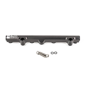 Manufactured with a large 0.69' internal bore, the fuel rail can support all necessary engine power requirements. They are CNC machined from extruded 6063 aluminum, media blasted, black anodized, and laser etched for a high quality surface finish. Like the OEM fuel rails, the injector bores are 14mm ID so factory injectors are permitted. The fuel rail is equipped with features to accept the OEM fuel injector clips (shown below).