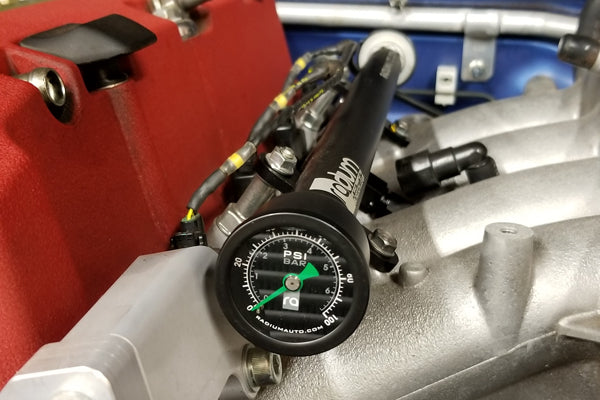 This large bore fuel rail features a large 0.69' diameter internal bore. It uses all 4 OEM mounting bosses. The fuel rail is machined, anodized, and laser etched for a high quality surface finish.