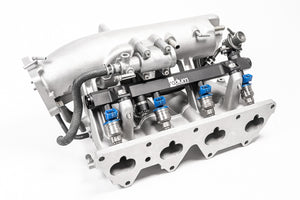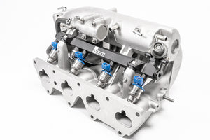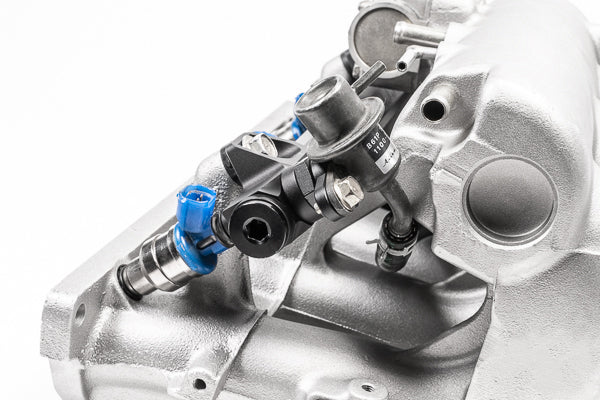 This 0.69 inch big bore fuel rail is CNC machined from billet 6061 aluminum, black anodized, and laser etched for a high quality surface finish. It is a direct replacement for the OEM fuel rail. A plumbing kit is available that provides all the necessary parts to install and plumb the fuel rail with OEM components.