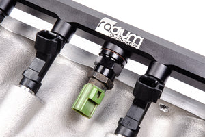 The Radium Engineering high flow secondary fuel rail is for the OEM lower intake manifold found on the Mazda 20B-REW rotary engine. The aluminum fuel rail is anodized black for compatibility with all popular fuel types including E85. Manufactured with a large internal bore, the fuel rail can support all necessary engine power requirements. The extra center port allows additional fuel system accessories such as the OEM fuel temperature sensor, a pressure transducer, Radium fuel pulse damper, etc.