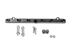 The fuel rail ports are tapped for 8AN ORB fittings. The extra center port allows additional fuel system accessories such as the OEM fuel temperature sensor, a pressure transducer, Radium fuel pulse damper, etc.
