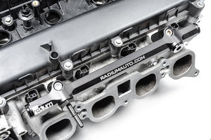 This Radium Engineering fuel rail is CNC machined from extruded 6063 aluminum, black anodized, and laser etched for a high quality surface finish. Like the original fuel rails, the injector bores are 14mm ID so factory injectors are permitted. Provisions for the OEM injector retaining clips are implemented as well. The rails are compatible with all fuel types including popular alcohol mixtures such as E85. Spacers and washers are included to thermally insulate the fuel rail from the cylinder head.