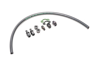 This kit replaces the restrictive OEM banjo bolt and runs a 6AN (3/8') hose directly from the fuel filter to the fuel rail. In addition, two FPR adapters are included to reuse either variation of the Mitsubishi OEM fuel pressure regulator. All necessary fittings are included for an easy bolt-in installation.