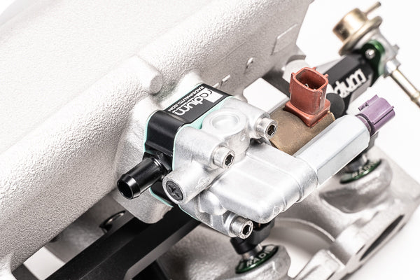 The OEM 2-bolt IACV bypass hard line is replaced by a billet aluminum IACV spacer kit to gain clearance for the top feed fuel rail. An anodized aluminum barb adapter and rubber hose is supplied to reroute the charge pipe hose externally to the manifold. One gasket is included for the IACV spacer. To replace the original IACV gasket, go HERE.