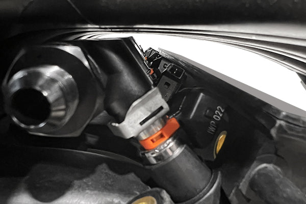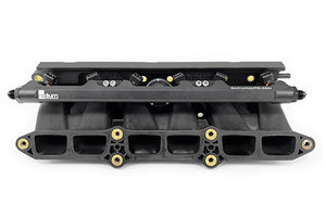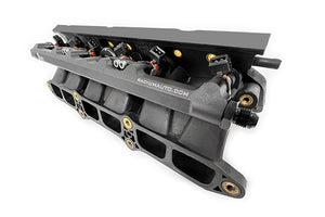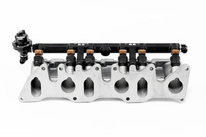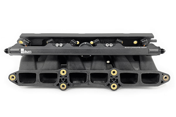 The late model engine uses a polymer lower intake manifold. It requires the short fuel rail mounts included in the kit. With late model lower intake manifolds, a Radium Engineering fuel pulse damper can be used in the center port. This fuel rail is compatible with the OEM late model upper intake manifold when using OEM equivalent fuel injectors.