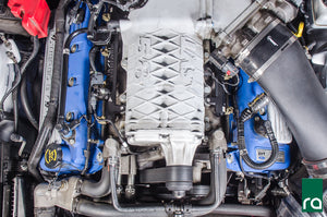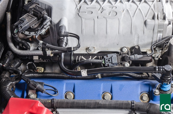 This kit offers a total of eight 3/4-16 (8AN ORB) threaded ports to allow plumbing of ancillary fuel system devices. In order to clear the supercharger's intake pipe, the LH fuel rail (shown above) features three ports. The lower center port for both rails are most commonly used for Radium Engineering fuel pulse dampers.
