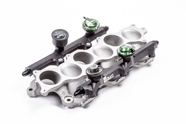 20-0956-PK Fuel Rail Plumbing, Nissan R35 GT-RWhen used with the 20-0556-02 fuel rails, this kit permits a bolt-on, plug and play affair. A stainless steel mount if provided for the Radium FPR. Low profile 90 degree SAE adapters with PTFE fuel hoses connect the OEM hard fuel lines to the FPR. PTFE fuel lines run from the FPR to the rear fuel rail ports. Two Radium fuel pulse dampers and a pressure gauge are included and all necessary adapter fittings.