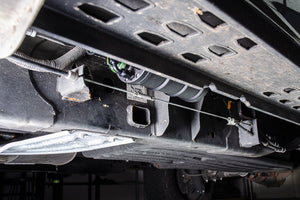 The Ford F150 Raptor install kit locates the FSTR-RA in a collision-safe area under the LH side of the truck. The polished stainless steel bracket solidly mounts to OEM mounting points.