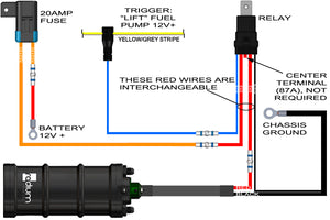 Also included are wiring components with flying leads featuring Raychem solderless butt splices, and a weatherproof fuse and relay to drive the FSTR-RA fuel pump. Wiring is very simple and takes less than 30 minutes to assemble. No soldering is required.