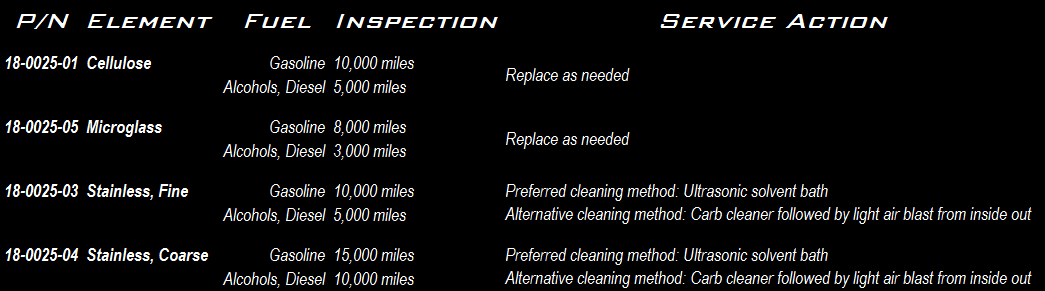 The Radium Engineering fuel filters are available with different filtration elements. Each option is discussed below.