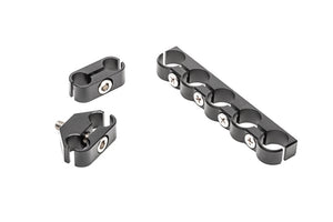 20-0231 HOSE SEPARATOR CLAMP, 5-WAYAnodized black billet aluminum clamp used for securing hose, tubing, wire harnesses, etc. Includes all stainless steel hardware (4 bolts and 2 sheet metal screws). Each of the 5 inner diameters (ID) are 9/16' (0.563inch or 14.3mm). |