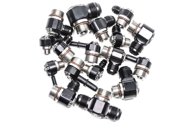 These swiveling fittings have the ability to rotate 360 degrees, even after installation. They are an excellent option for 90-degree connections and are very low profile.