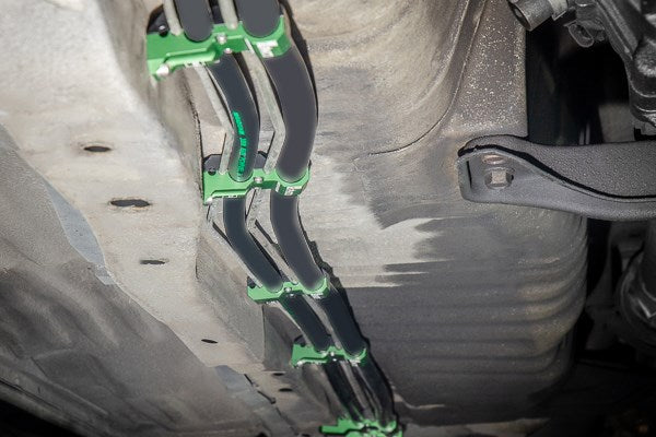 20-0627 HICAS LINE RETAINER KIT, NISSANThese retainers are only for Nissan vehicles that use HICAS (High Capacity Actively Controlled Steering) on the rear wheels. The HICAS lines share the same plastic retainers as the fuel and brake lines. If these retainers are ever removed, the HICAS lines will be left hanging. This kit is perfectly compliments the the 20-0626 Fuel Brake Line Retainer Kit above. When installing the HICAS retainer kit, equally space all 5 clamps as shown above. Because the 2 HICAS lines are rigidly secured to the chassis in the front and the rear, these clamps do not secure to the unibody. They are already rigid enough to not sag. COMPATIBILITY