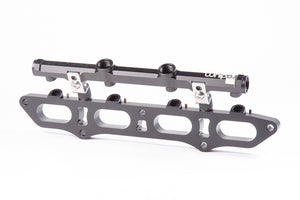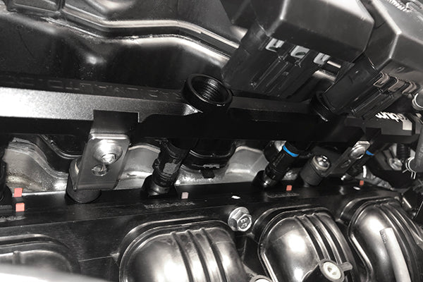 The fuel rail features a large 0.63" internal diameter bore. It is CNC machined from extruded 6063 aluminum and laser etched for a high quality surface finish. All 4 ports are machined with 8AN ORB (3/4-16 female) threads. Note that the 2 top fuel rail ports will need to be plugged with 14-0150 unless the plastic OEM wiring harness carrier is modified (see below). For a list of all 8AN ORB adapter fittings, go HERE.
