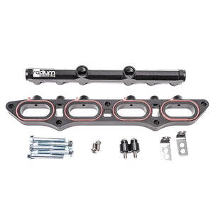 The Radium Engineering Port Injection Kit (PIK) installs between the intake manifold and the cylinder head. It permits the use of port injectors to add additional fuel on high-horsepower K20C1 engines. This does NOT replace the OEM direct injection system. The kit includes the PIK adapter plate, custom fuel rail, fuel rail mounting hardware, and OEM Honda gaskets, as shown in the below picture. It is compatible with all fuel types including popular alcohol mixtures such as E85.