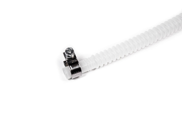 There are 2 inner diameter sizes available including 5/16" (8mm) and 3/8" (10mm). When installing, run hot water over the ends first to loosen the material. This allows the tubing to fit snugly over the barb. Next, torque the reusable stainless steel SAE J1508 clamps to 13.3 in-lbs. These clamps provide a 360 degree seal with rolled edges to protect the tubing.