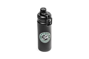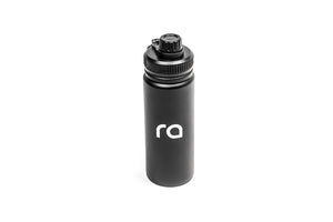 Stainless steel water bottle with a loop handle and a screw-on cap. Features a wide mouth for easy filling and easy cleaning. Two Radium logos, as depicted below.